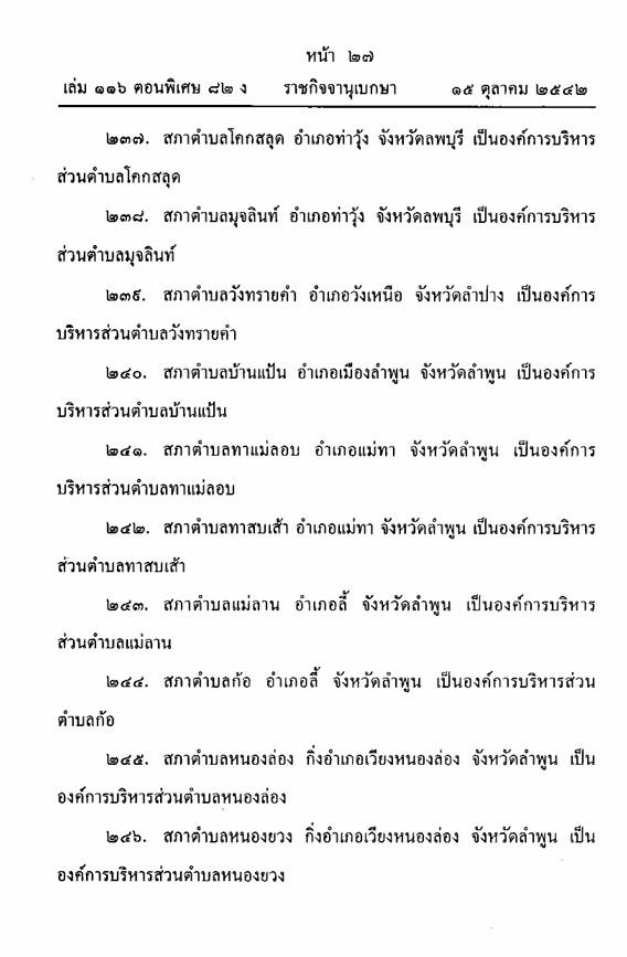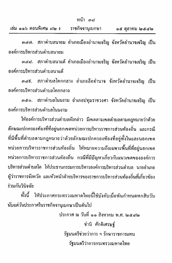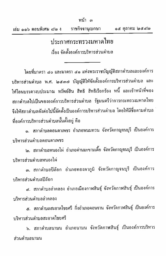 โดยที่มาตรา 40 และมาตรา 41 แห่งพระราชบัญญัติสภาตำบลและองค์การบริหารส่วนตำบล พ.ศ.2537 บัญญัติให้จัดตั้งองค์การบริหารส่วนตำบล และให้โอนบรรดางบประมาณ ทรัพย์สิน สิทธิ สิทธิเรียกร้อง หนี้และเจ้าหน้าที่ของสภาตำบลเป็นไปขององค์การบริหารส่วนตำบล รัฐมนตรีว่าการกระทรวงมหาดไทย จึงให้สภาตำบลจัดตั้งขึ้นเป็นองค์การบริหารส่วนตำบล โดยให้มีชื่อตามตำบลที่องค์การบริหารส่วนตำบลตั้งอยู่